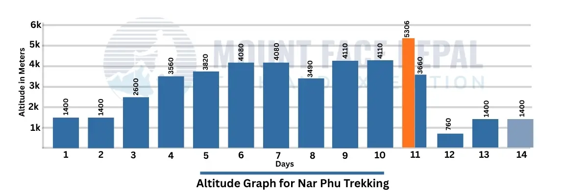 The Nar Phu Valley Trek difficulty involves long walking days across remote Himalayan terrain where steep climbs, rocky paths and high-altitude valleys specially makes the journey physically challenging. This adventurous Nar Phu Valley Trekking route passes through narrow gorges, high suspension bridges and isolated mountain villages where daily ascents often reaches higher altitudes gradually. Along the scenic Nar Phu Valley Trek itinerary, trekkers walk for about six to eight hours on the rugged landscapes daily before reaching remote settlements such as Meta, Nar and Phu which helps for acclimatization. The challenging nature of the Nar Phu Trek Nepal mainly comes from the high altitude, distance and the remote environment during this restricted valley trek.