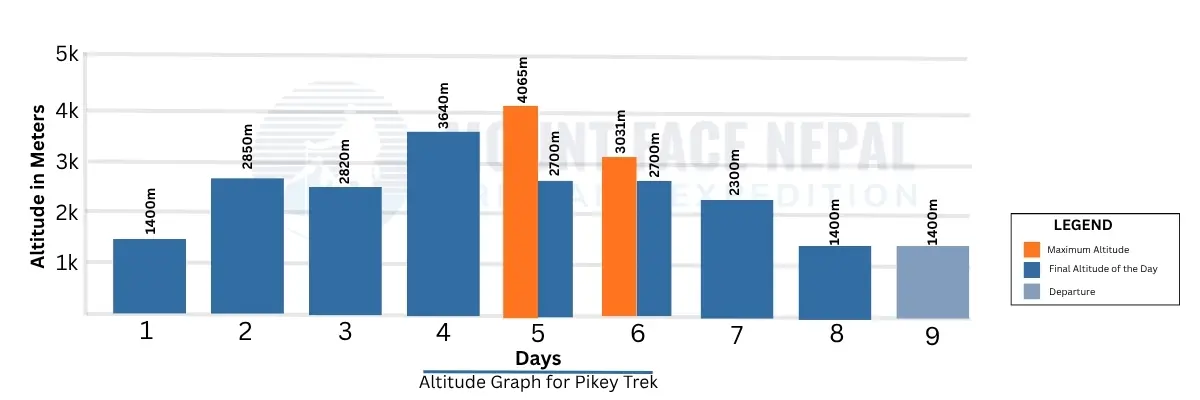 The Pikey Peak Trek is generally considered a moderate Himalayan trekking journey, where travelers are rewarded with peaceful mountain landscapes and gradual walking trails in the lower Everest region. The important challenge during Pikey Peak Trekking Route is the steady altitude gain which reaches up to Pikey Peak summit (4,065 meters), which stands as the highest point of the journey. As Pikey Peak Trek Nepal route moves through forest trails, village paths and open ridgelines, the walking days usually involve about 4–6 hours of trekking with gradual ascents and descents.